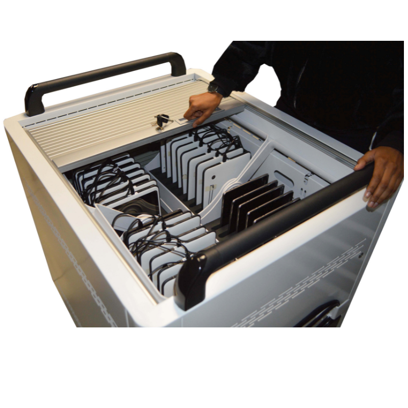 - Zone sécurisée dans laquelle on trouve le système de chargement séquentiel des tablettes. Une minuterie intelligente permettant de définir le temps de charge. 3 prises électriques supplémentaires. Protection des surtensions. Interrupteur marche/arrêt avec disjoncteur 15A pour charger les tablettes