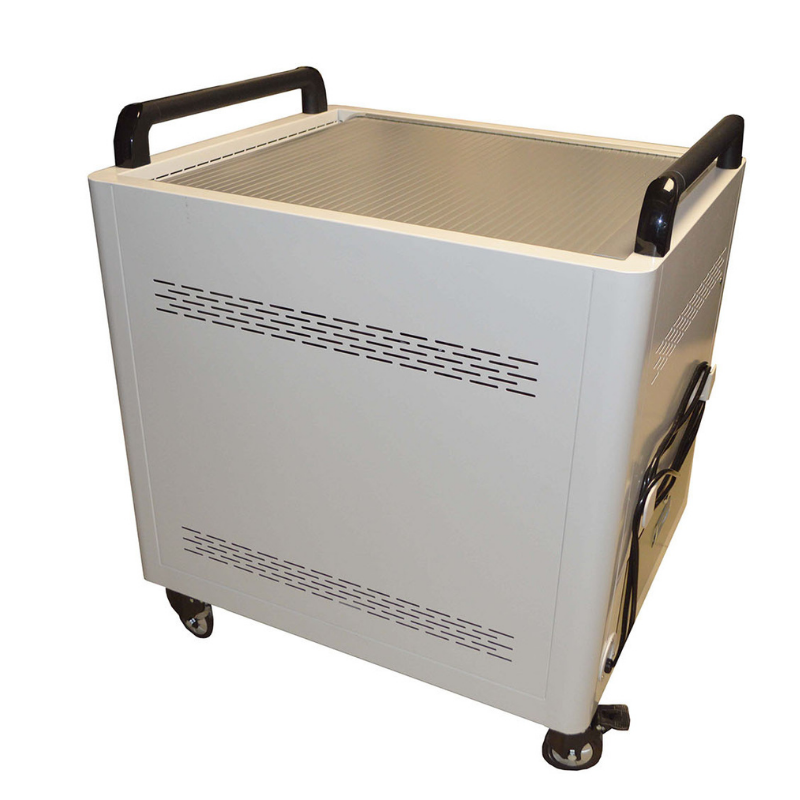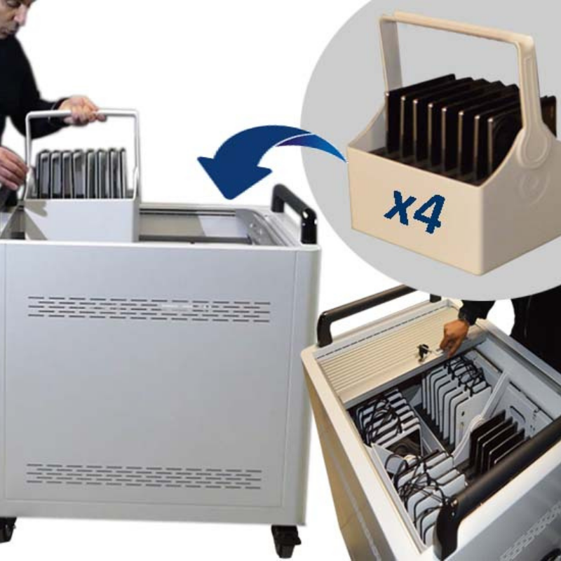 - Chariot construit en acier époxy, composé de 4 paniers pour charger de 24 à 32 tablettes max 10”, sous Android et iOS.