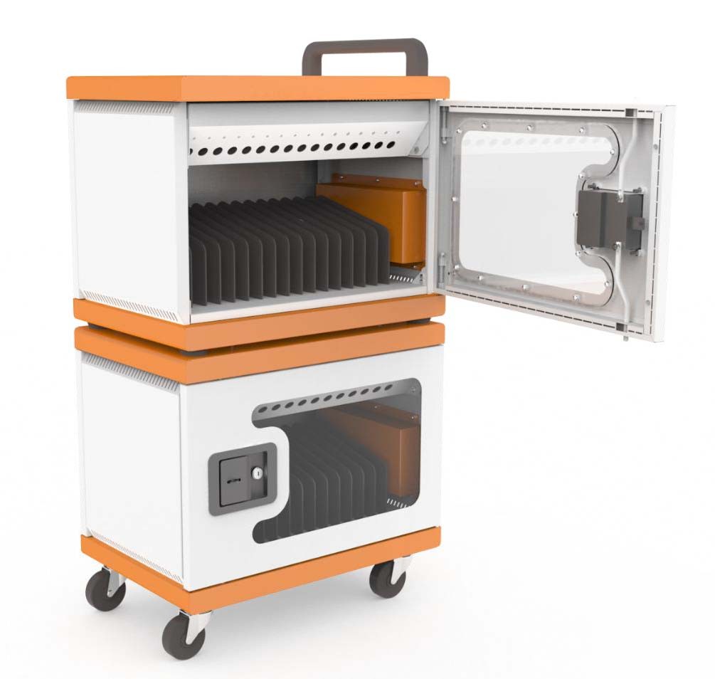 Possibilité d’empiler 2 solutions, obtenant un chariot mobile pour 32 tablettes ou PC portables.