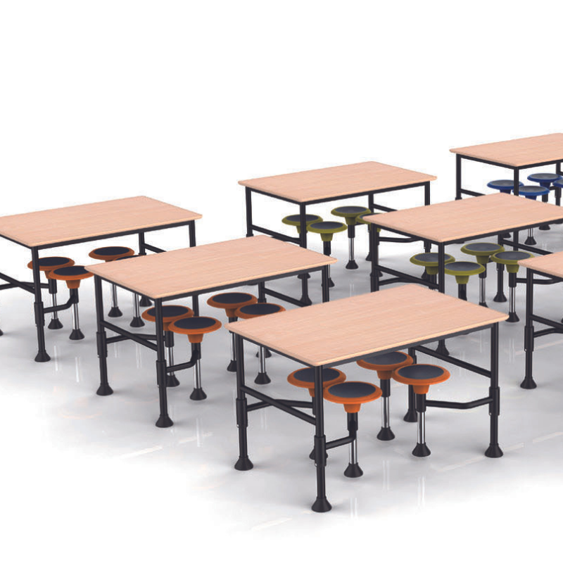 JUK 165 est une table rectangulaire avec 4 chaises intégrées et reliées à la table. Solide, ergonomique et pratique, elle est idéale pour le travail de groupe.