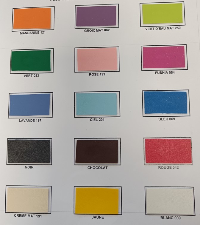 - 10 couleurs (Vert, Orange, Violet, Vert d'eau, Rose, Fushia, Lavande, Ciel, Bleu, Noir, Chocolat, Rouge, Crème, Jaune, Blanc)